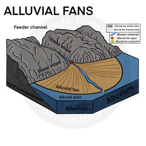 - Alluvial fans are formed when streams flowing from mountains break into foot slope plains of low gradient.