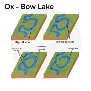 - As meanders grow into deep loops, they may get cut-off due to erosion at the inflexion points and are left as independent water bodies, known as ox-bow lakes.