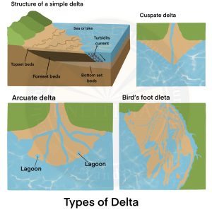 - The sea adjoining the delta should be shallow or else the load will disappear in the deep waters.