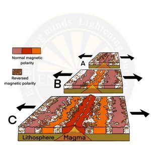 • On studying the paleomagnetic rocks on either side of the oceanic ridges, it was found that alternate magnetic rock stripes were flipped so that one stripe would be of normal polarity and the next, reversed.